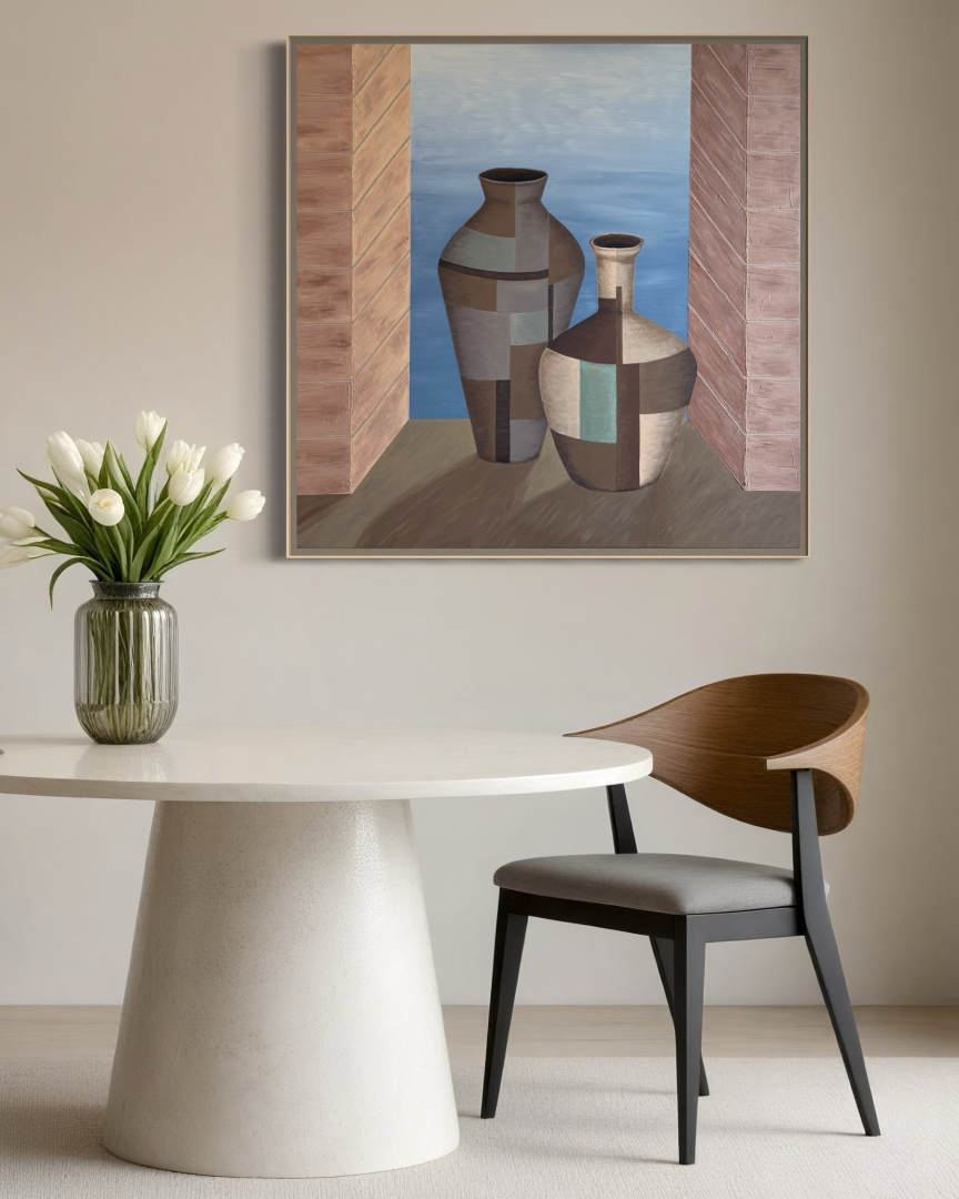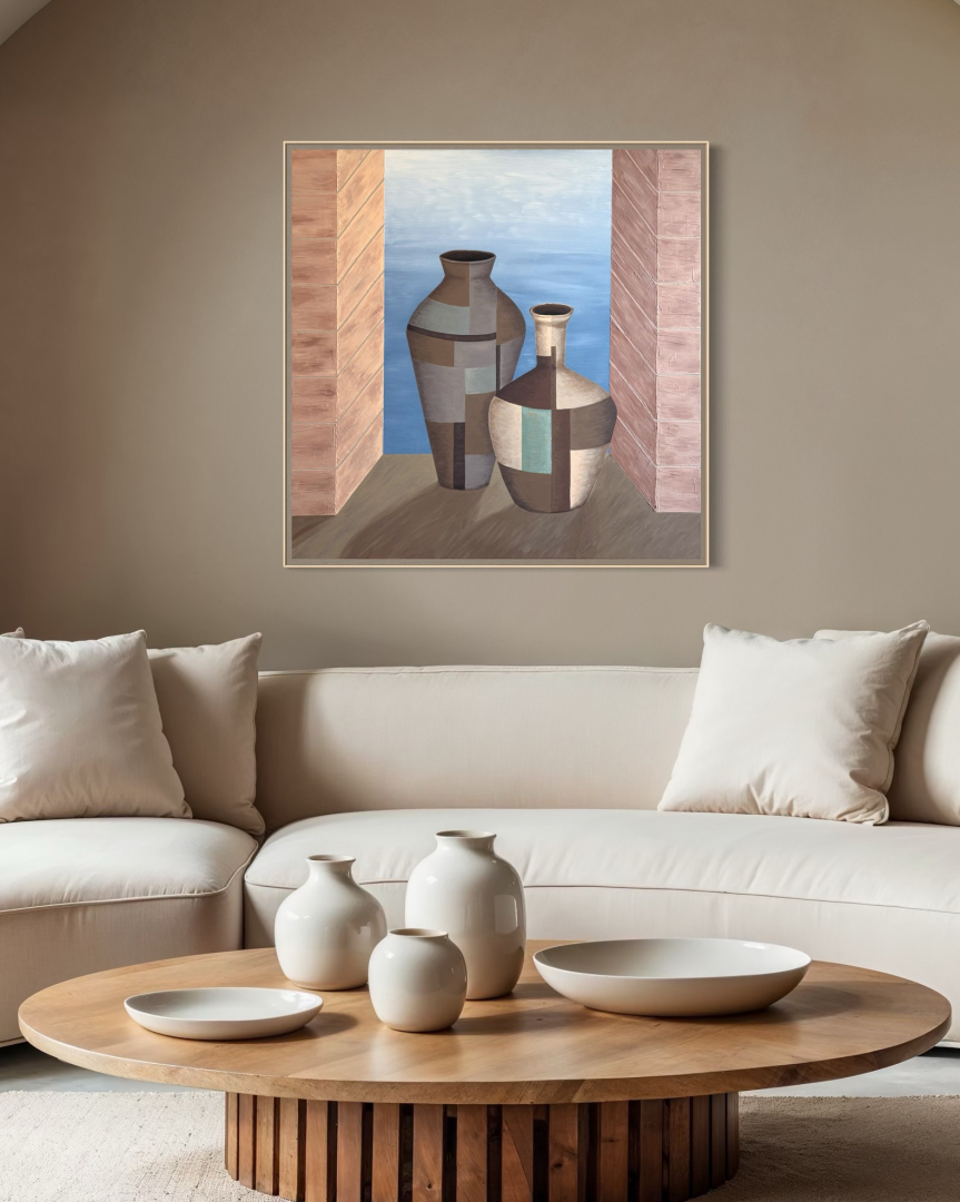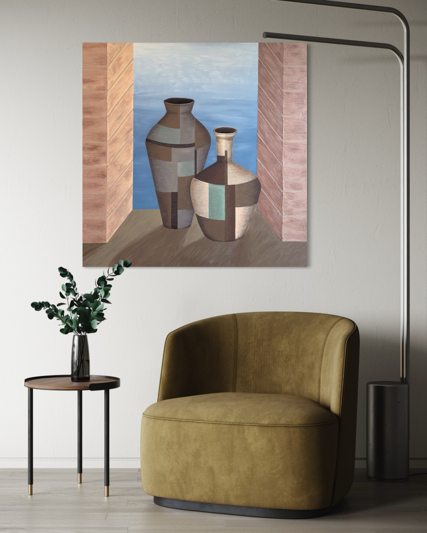 Akril festmény 90*90*2 cm, feszített vásznon. Ez az alkotás örök nyári, mediterrán hangulatot ad otthonodnak. Realisztikusabb stílus keveredik, az általam nagyon szeretett térhatást keltő, geometrikus stílussal. A tégla oszlopok élőben nem csak térhatást keltenek, hanem strukturált felületével valódi tégla látszatot adnak a szemnek. Oldalán is festett, így keretezés nélkül is jól mutat.