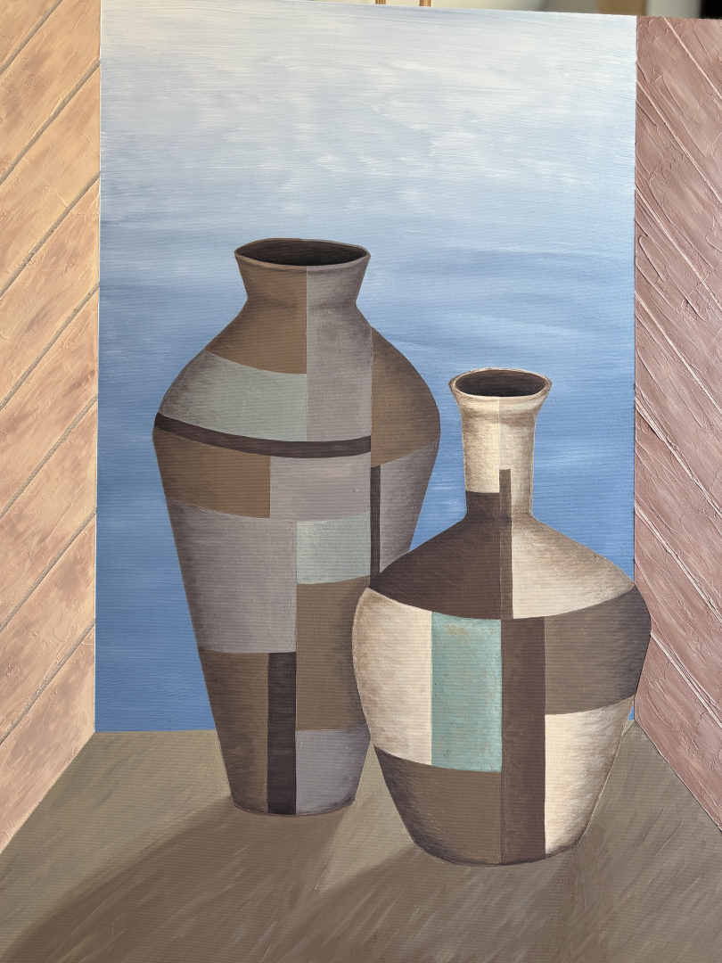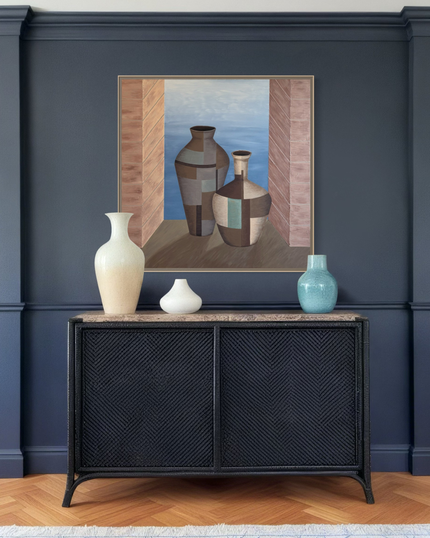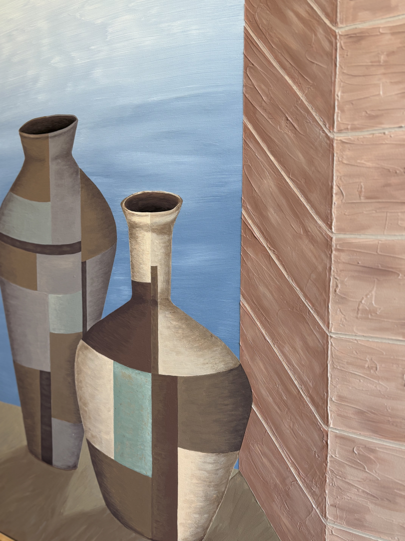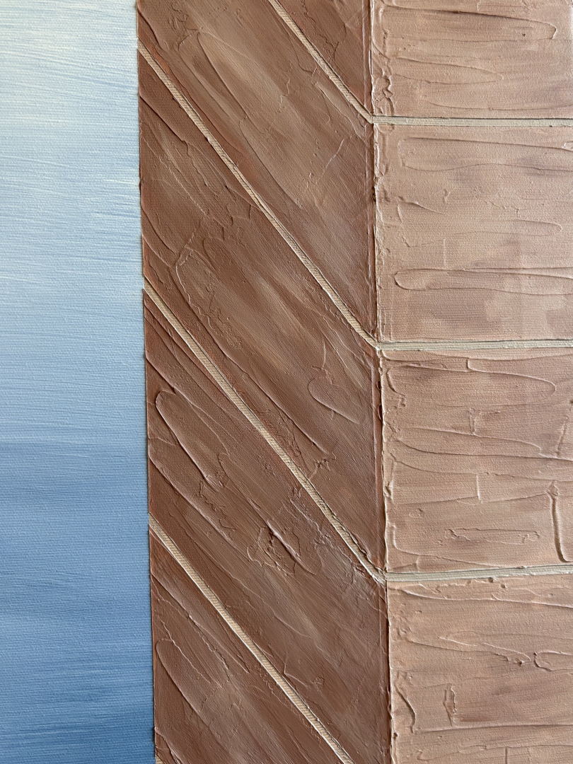 Akril festmény 90*90*2 cm, feszített vásznon. Ez az alkotás örök nyári, mediterrán hangulatot ad otthonodnak. Realisztikusabb stílus keveredik, az általam nagyon szeretett térhatást keltő, geometrikus stílussal. A tégla oszlopok élőben nem csak térhatást keltenek, hanem strukturált felületével valódi tégla látszatot adnak a szemnek. Oldalán is festett, így keretezés nélkül is jól mutat.