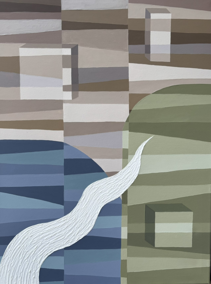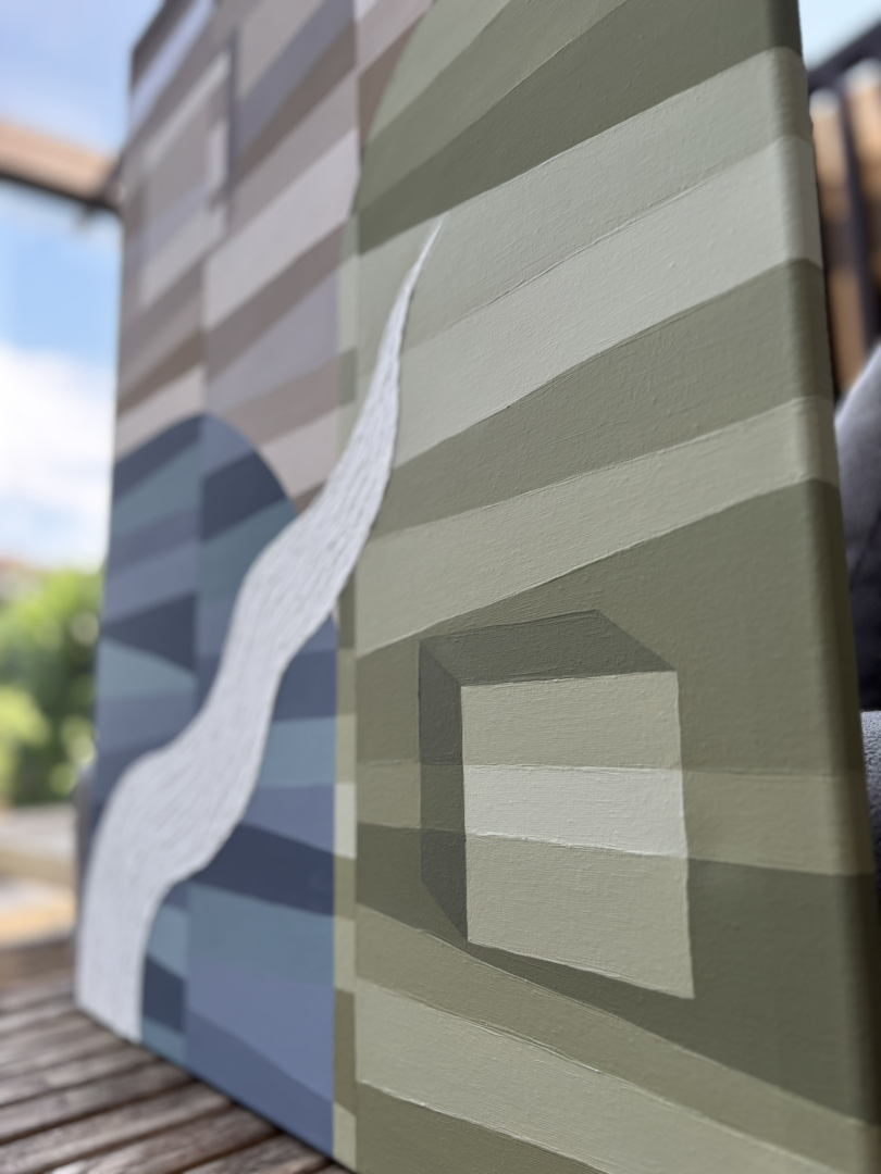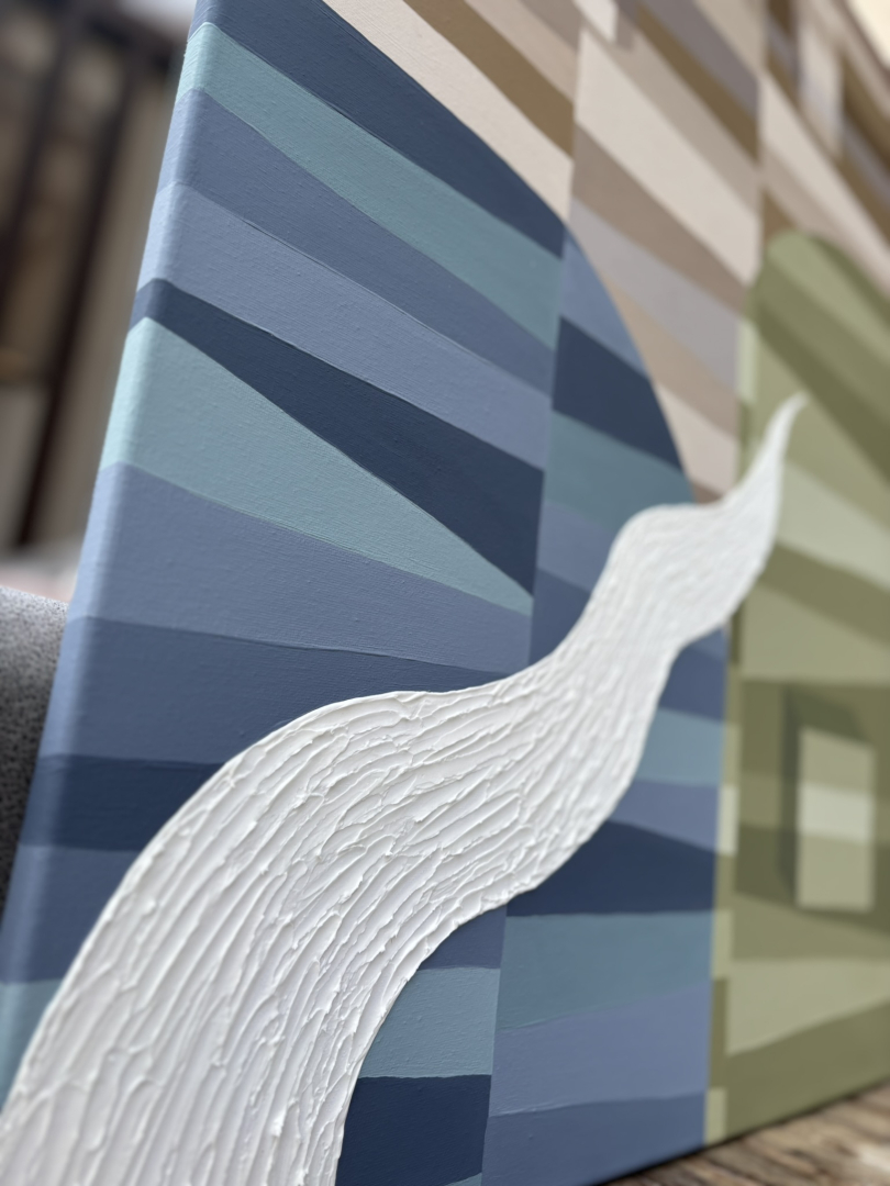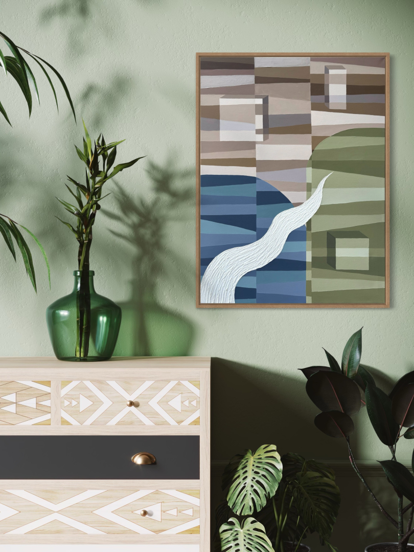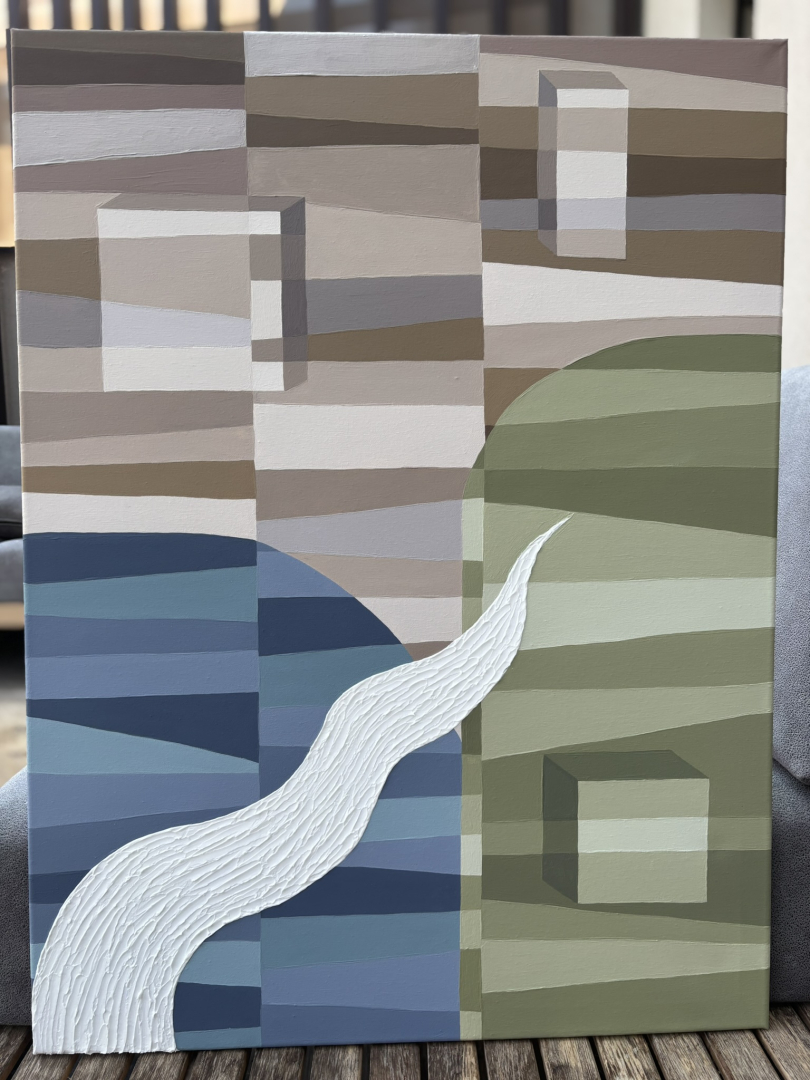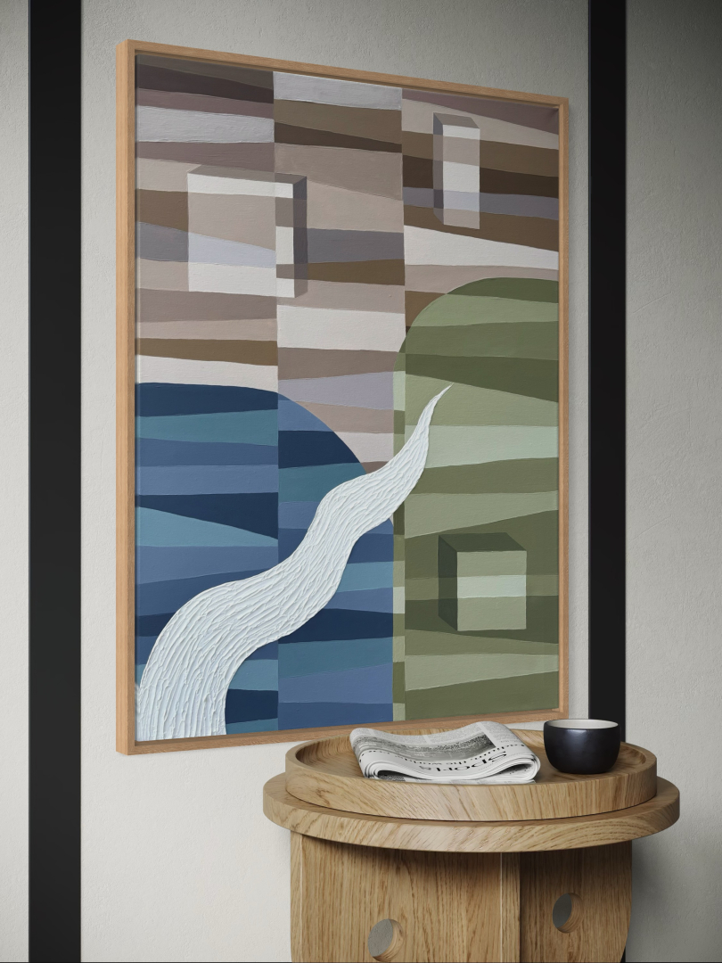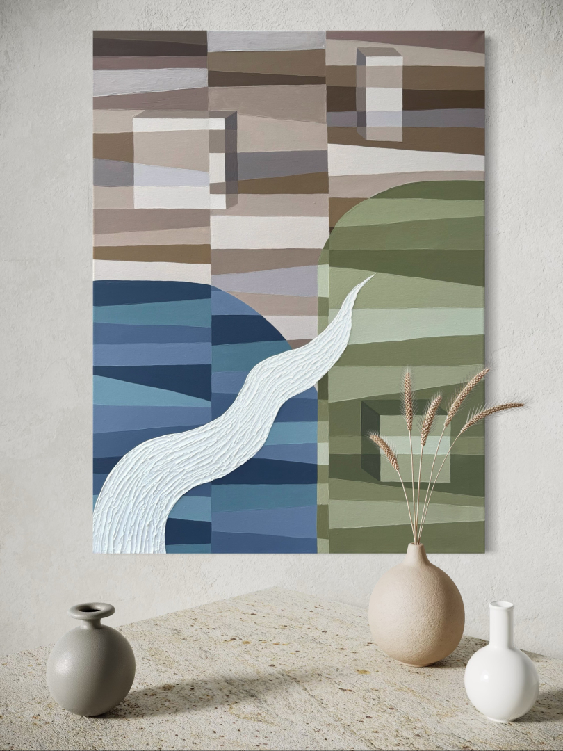 Geometrikus stílusban készült, akril festmény 60*80*2 cm, feszített vásznon. Lágy, harmonikus színeivel, nyugodtságot visz az otthonába. Oldalán is festett, így keretezés nélkül is jól mutat.