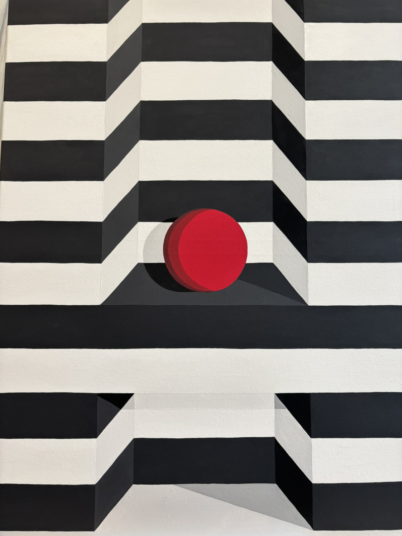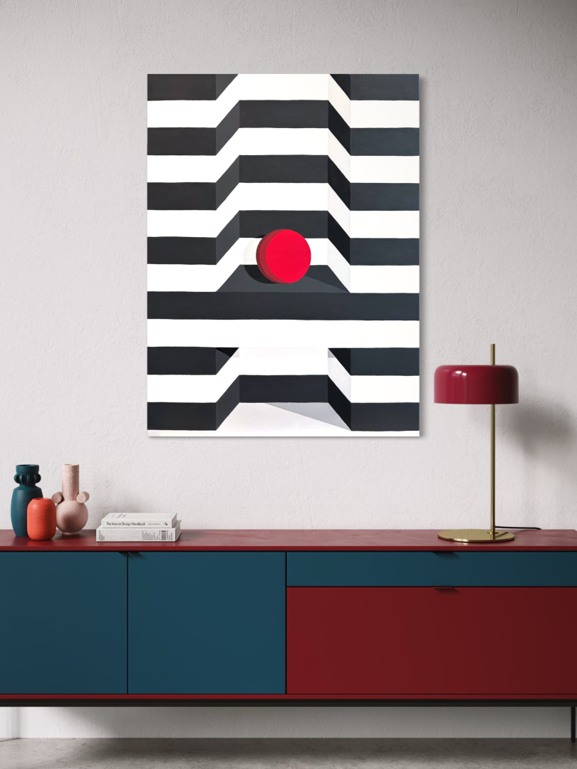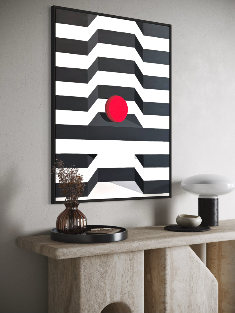 Geometrikus stílusú, akril festmeny 60*80*2 cm, feszített vásznon. Letisztult, de mégis figyelemfelkeltő színezetével, hihetetlen szemet megtévesztő térhatásával, extravagáns hangulatot visz otthonodba.