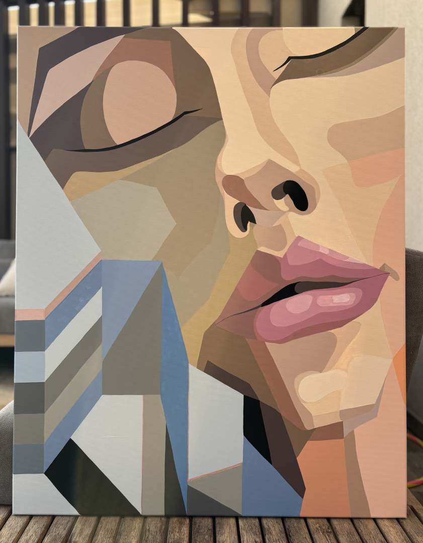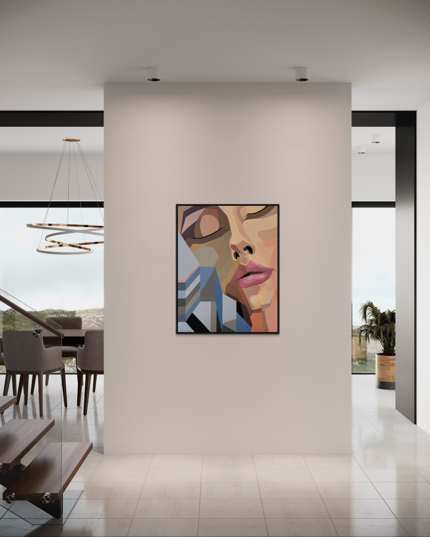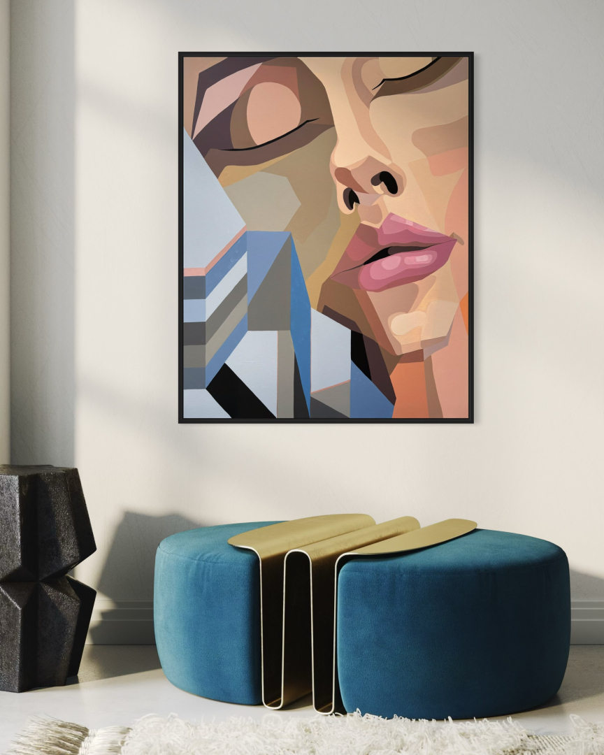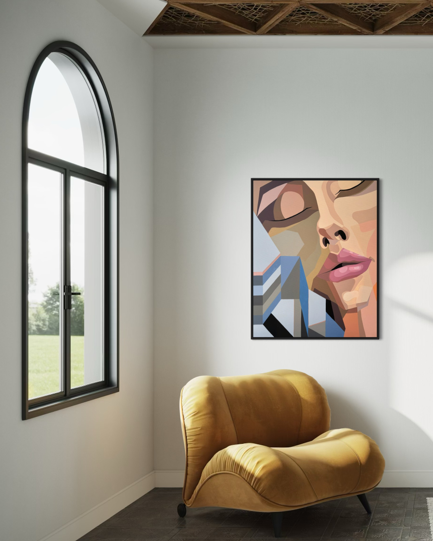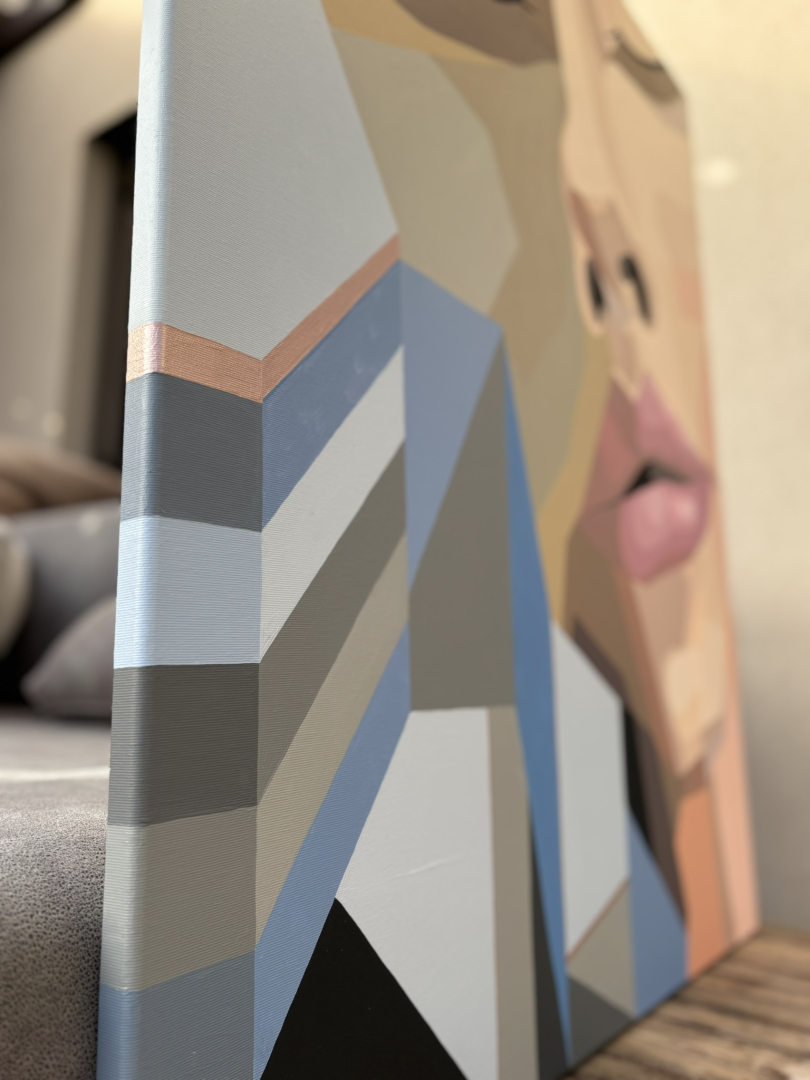 Geometriai formákból alkotott női arc. Akril festmény, 80*100*2 cm, feszített vásznon. Modern és klasszikus belső terekhez is remekül illő alkotás. Fiatalos lendületet ad a nappalinak, étkezőnek, vagy akár hálószobának egyediséggel, designal megtölve.
