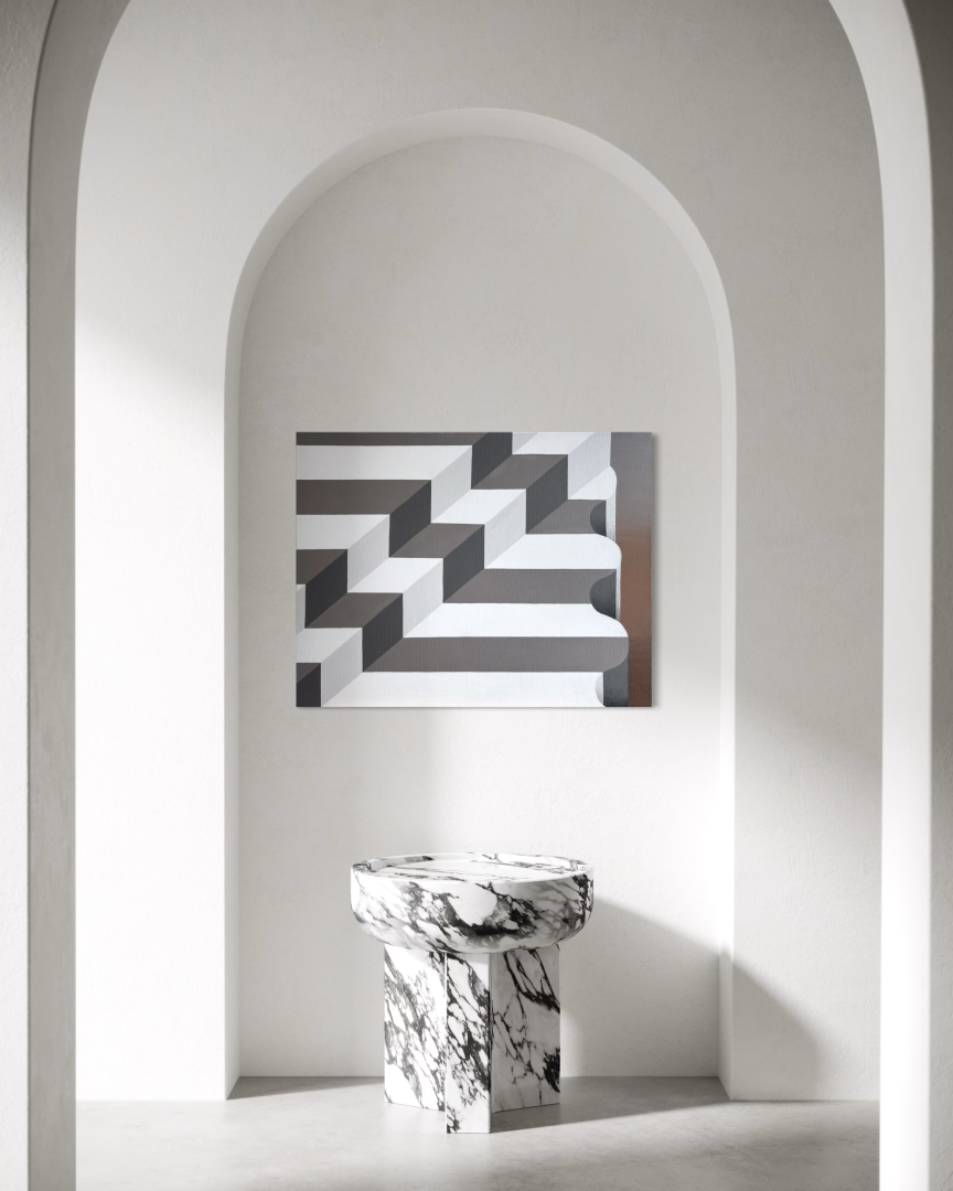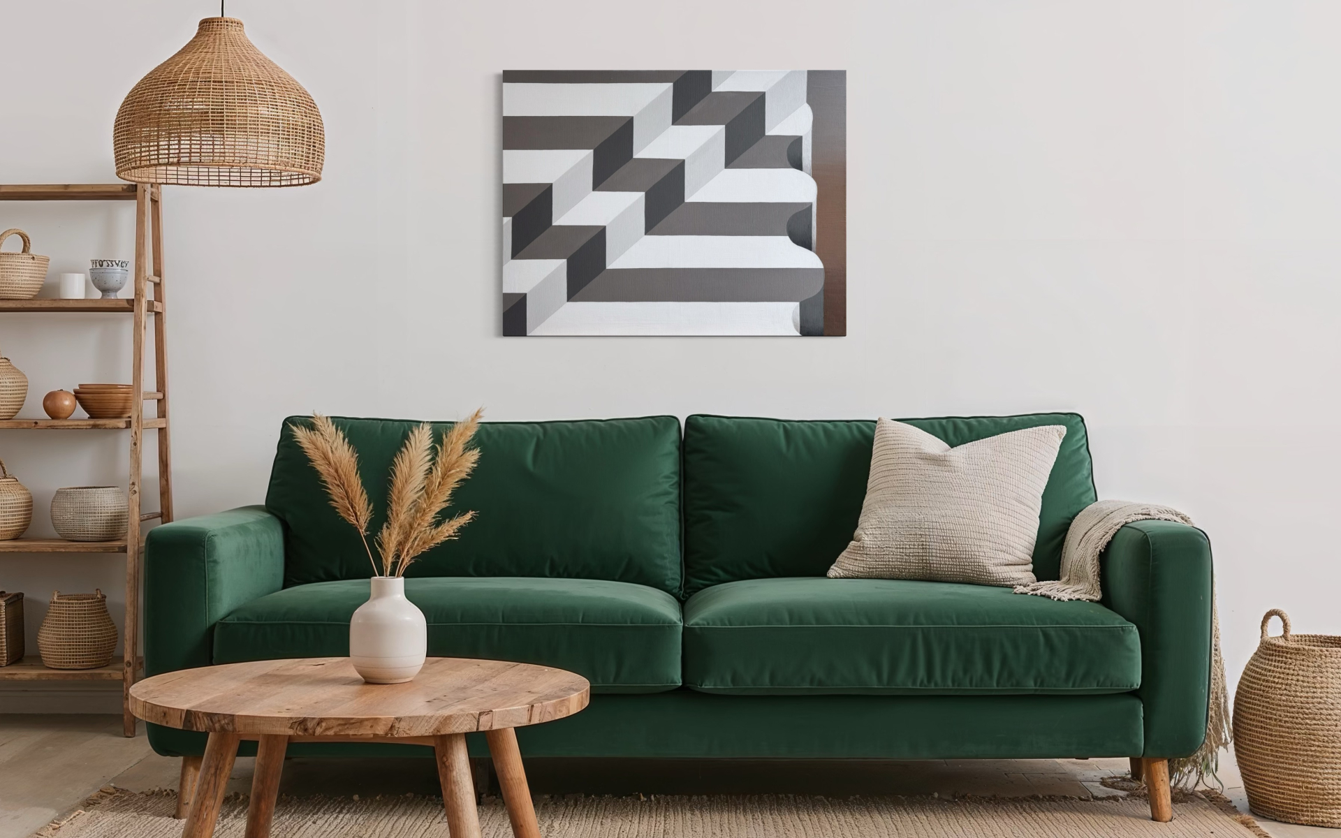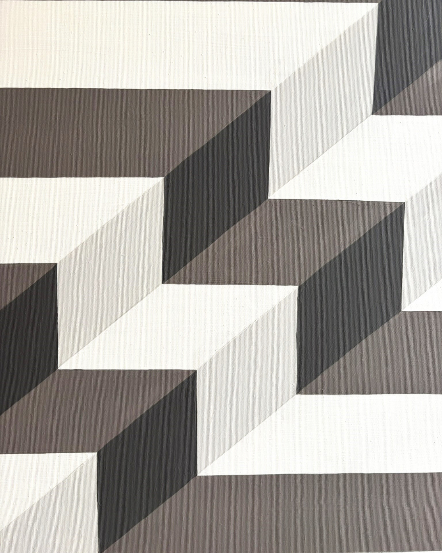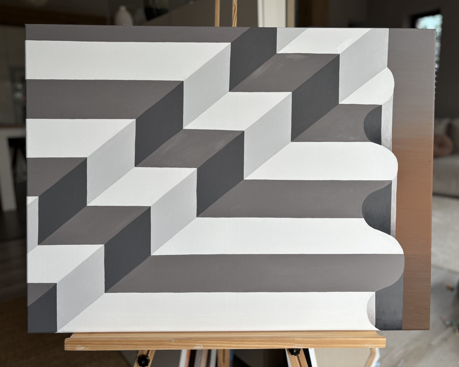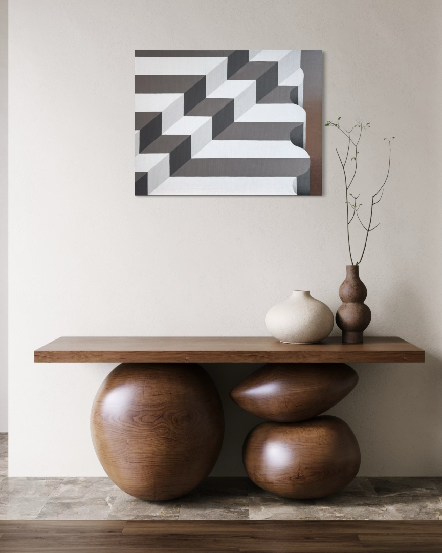 Geometrikus stílusban készült, akril festmény 60*80*2 cm, feszített vásznon. Letisztult stílusával, elegáns éke lehet otthonodnak. Optikai illúzióval megtéveszti szemünket, előtte állva különleges térhatású élményt ad a nézőjének!