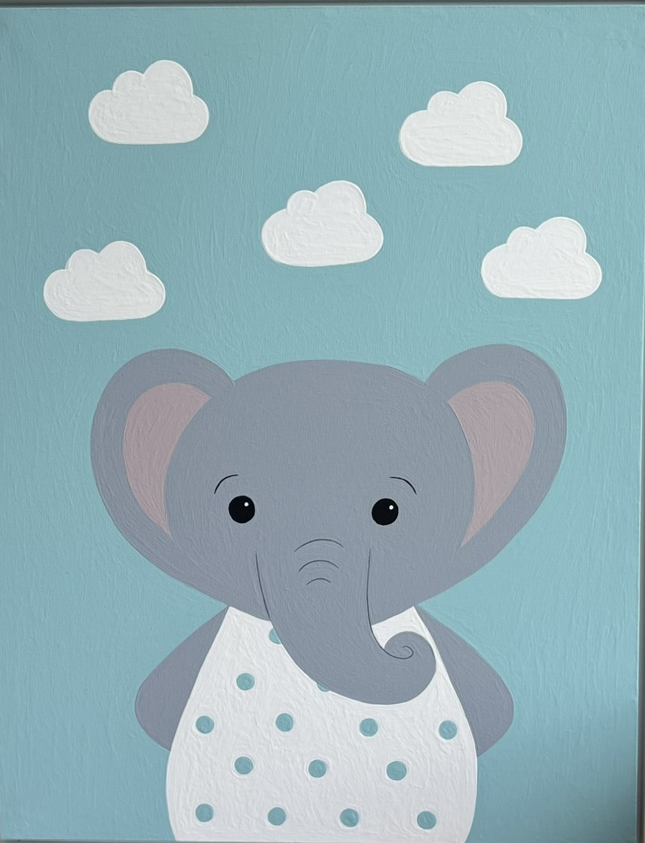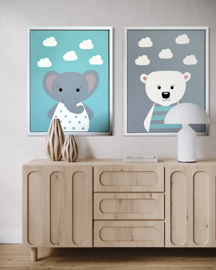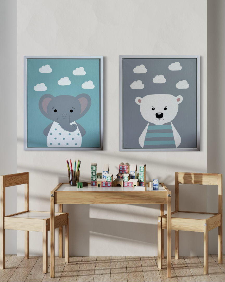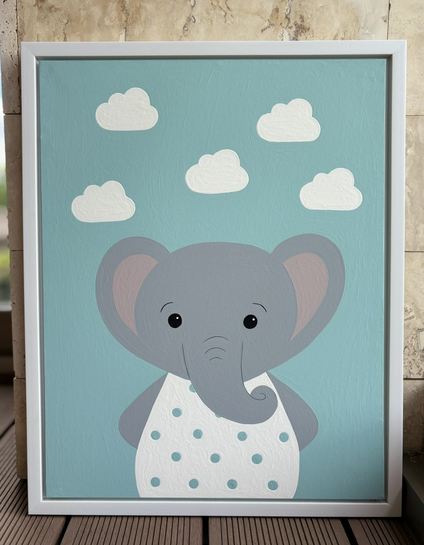 Édesanyává válásom élménye ihlette, minimalista stílusban készült állatfigura festményeimet. Mackó és Elefáni a sorozat első alkotási, melyeket kisfiammal a pocakomban alkottam. Szeretetteljes, meghitt, üde hangulatot ad egy gyermekszobának, vagy akár játszósaroknak, babaszobának. Minden alkotásom tele van érzelemmel, de ezek a gyermekeknek szóló képek csórdultig vannak szeretettel!