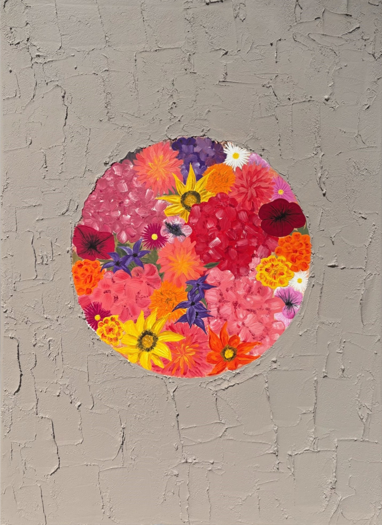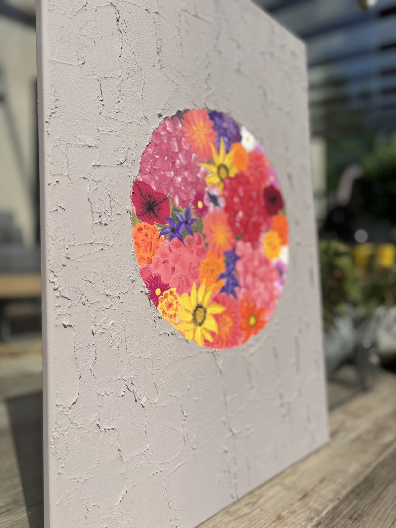 Üde színekben ragyogó 50x70*2 cm-es akril festmény, feszített vásznon. Struktúrált hatású alapon, a tavaszi virágzás varázslatos világa.