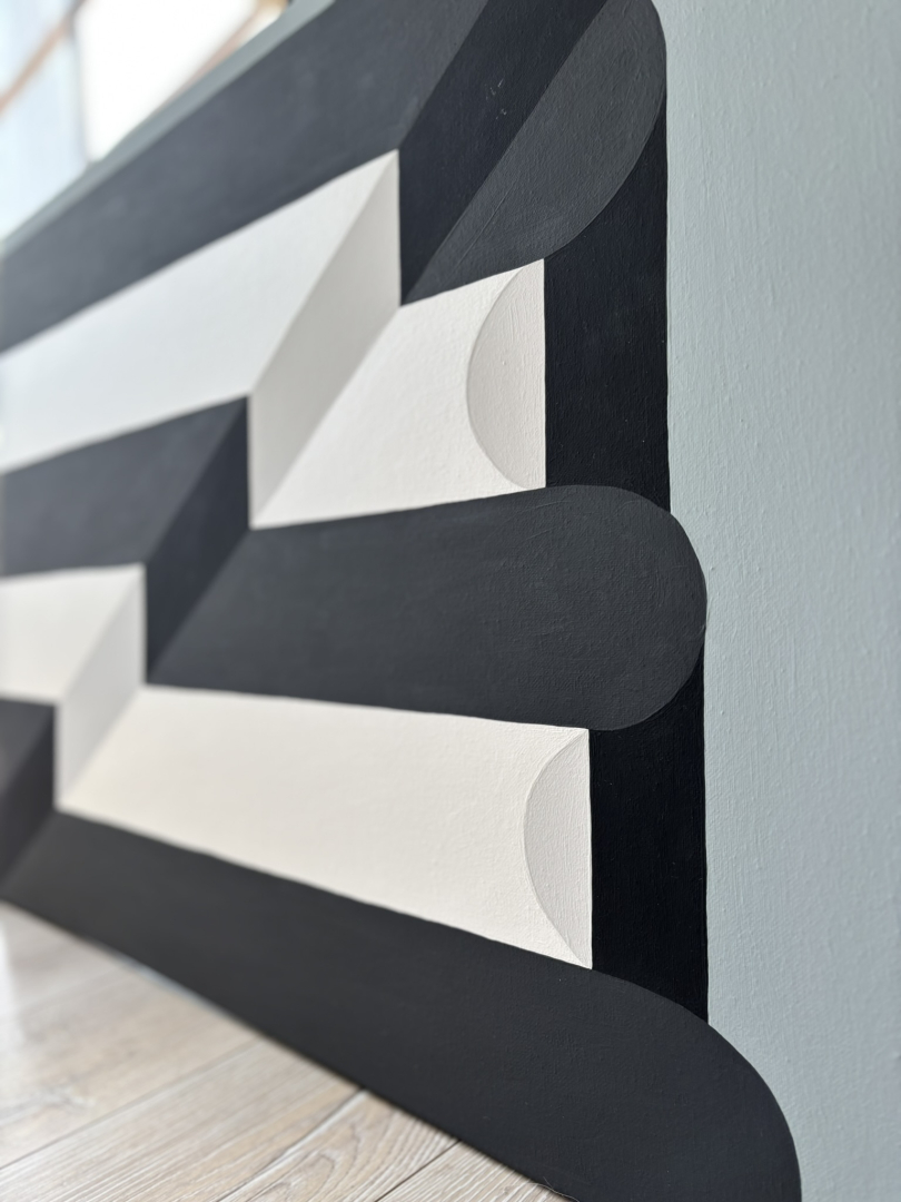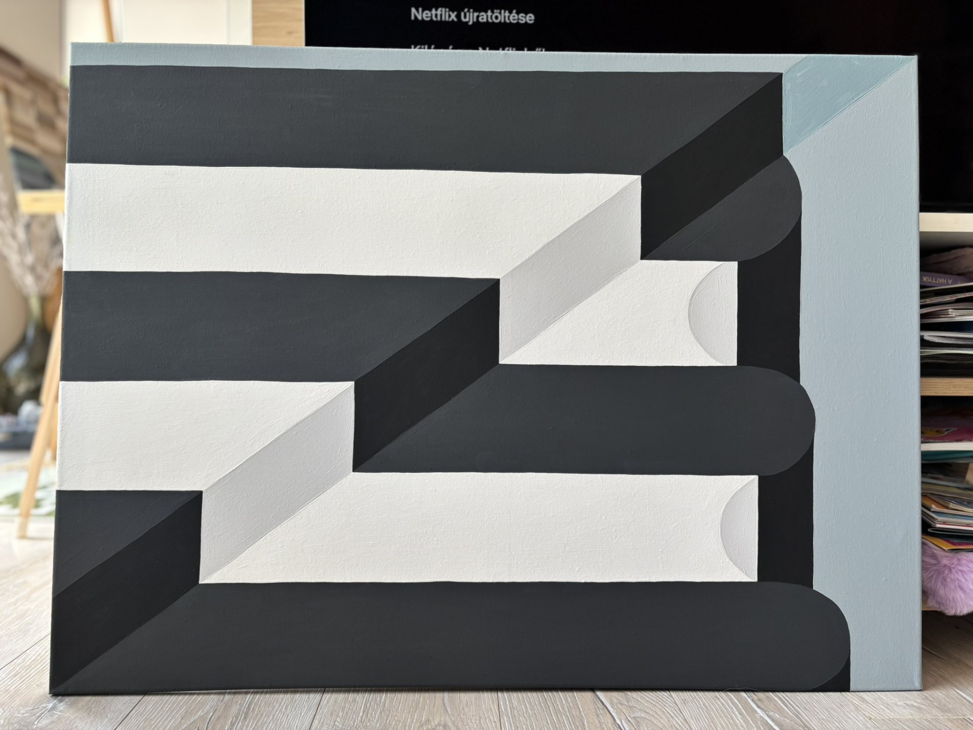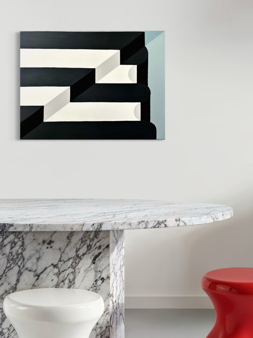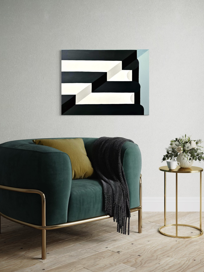 Geometrikus stílusban készült, akril festmény 60*80*2 cm, feszített vásznon. Letisztult stílusával, elegáns éke lehet otthonodnak.
